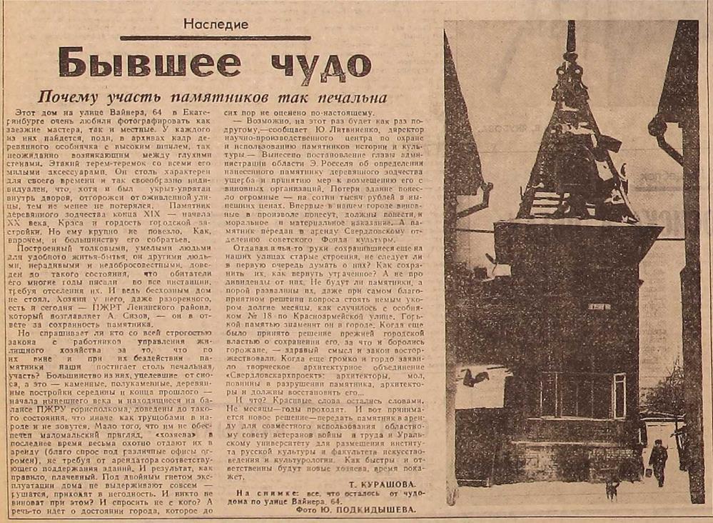 Дом на Вайнера, 64 — памятник деревянного зодчества конца XIX — начала ХХ века, краса и гордость городской застройки. Но ему крупно не повезло, как, впрочем, и большинству его собратьев: нерадивыми и недобросовестными людьми он доведен до такого состояния, что обитатели многие годы писали во все инстанции, требуя их отселения. Вынесено постановление главы администрации области Э. Росселя об определении нанесенного памятнику ущерба и принятию мер к возмещению его с виновных организаций. А памятник передан в аренду Свердловскому отделению Советского фонда культуры.