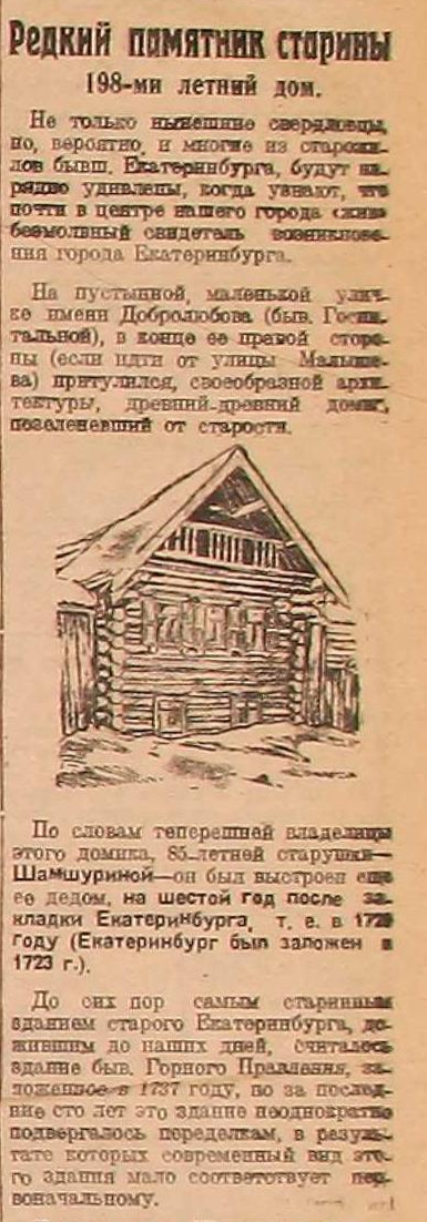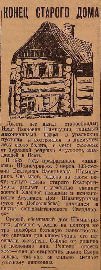 В начале XVIII века старообрядец Иван Иванович Шамшурин, гонимый никонианцами, бежал в уральские пустоши и построил дом в дремучем лесу около болота, в семи саженях от речки Акулинки, впадавшей в Исеть. В 1932 году прекратилась «династия» Шамшуриных. Умерла 103-летняя Екатерина Васильевна Шамшурина, и ее дом (угол ул. Добролюбова) очутился в центре социалистического Свердловска. Старый дом, вросший в землю на полтора метра, приобрел большую известность: его снимали для киноэкрана, его посещали экскурсии. Дом был снесен для расширения дорожной сети.
