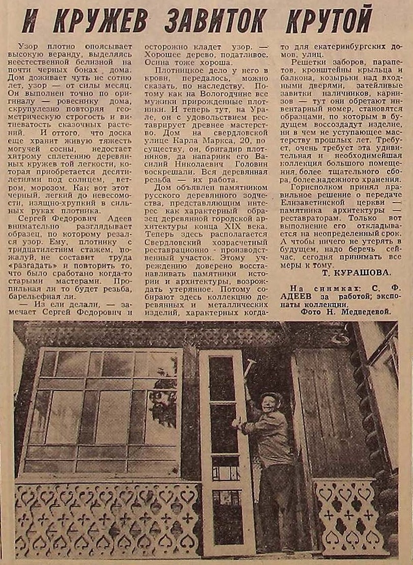 Плотник Сергей Федорович Адеев реставрировал памятник русского деревянного зодчества - характерный образец деревянной городской архитектуры конца XIX века. В начале 1980-х годов здесь располагался Свердловский хозрасчетный реставрационно-производственный участок. Этому учреждению было доверено восстанавливать памятники истории и архитектуры, возрождать утерянное.