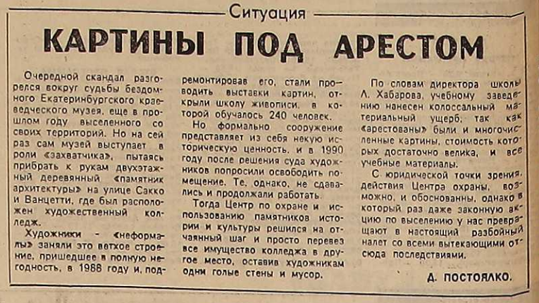 В 1988 году художники-неформалы (руководитель ЭХО - экспериментальных художественных мастерских - Лев Хабаров) заняли ветхое строение, пришедшее в полную негодность, отремонтировали дом и стали проводить выставки картин, открыли школу живописи на 240 человек. По решению суда художников попросили освободить помещение, так как городом было решено сделать в этом здании музей