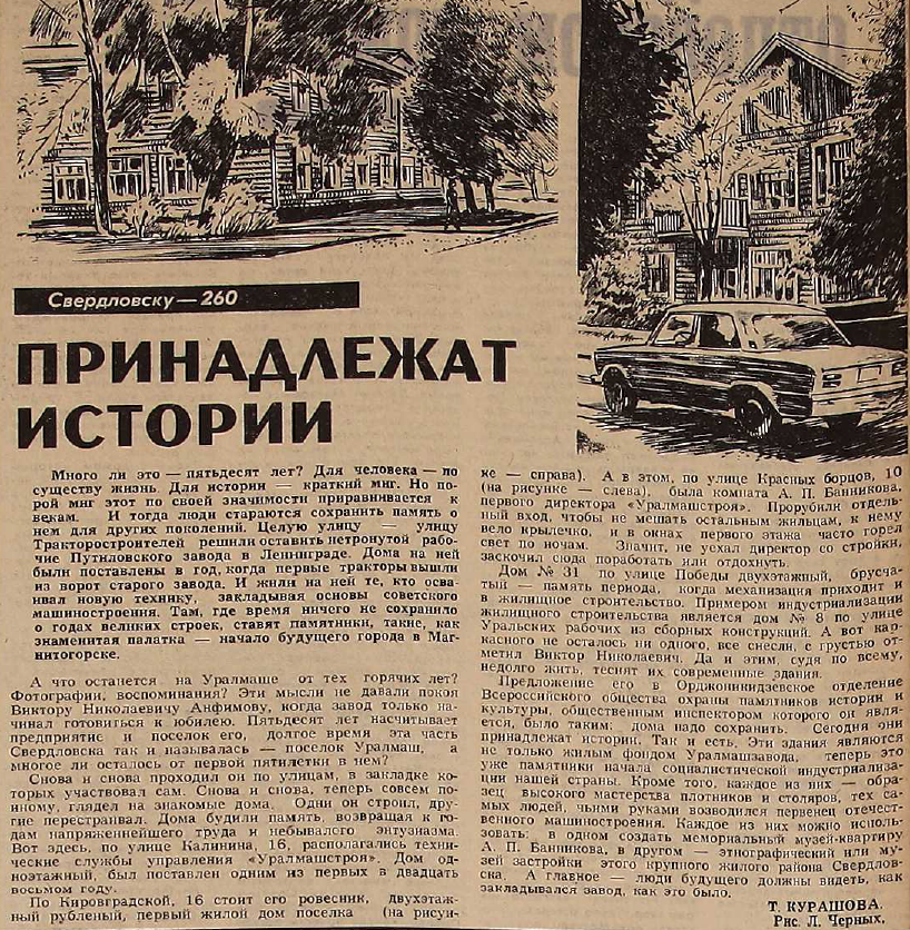 Предложение Виктора Николаевича Анфимова, участника строительства района Уралмаш и общественного инспектора Свердловского отделения ВООПИК: поставить на государственную охрану комплекс деревянных рубленых домов по ул. Кировградской как памятники начала социалистической индустриализации страны.