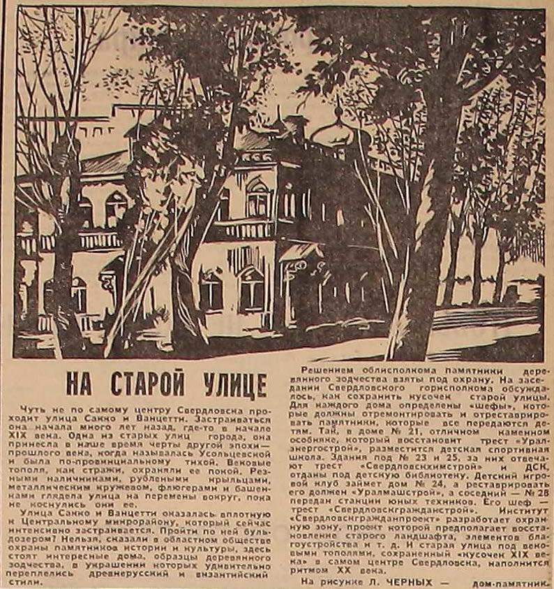 В 1981 году газета "Уральский рабочий" сообщала, что красивейшие образцы деревянного зодчества на ул. Сакко и Ванцетти взяты под охрану. Для каждого дома были определены «шефы», которые должны отремонтировать и отреставрировать памятники (Уралэнергострой, Свердловскхимстрой, Уралмашстрой, Свердловскгражданстрой). Свердловскгражданпроект разрабатывал охранную зону, предполагалось восстановление старого ландшафта, элементов благоустройства.
