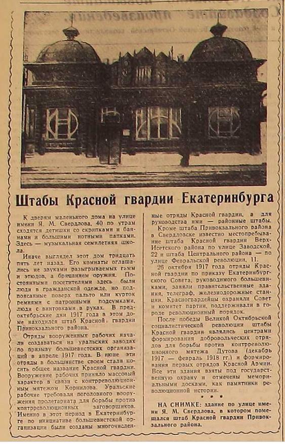 В здании на ул. Свердлова, 40 размещалась музыкальная семилетняя школа. В предоктябрьские дни 1917 года в этом доме находился штаб Красной гвардии Привокзального района. Здание было взято под государственную охрану и отмечено мемориальной доской как памятник революционной истории.